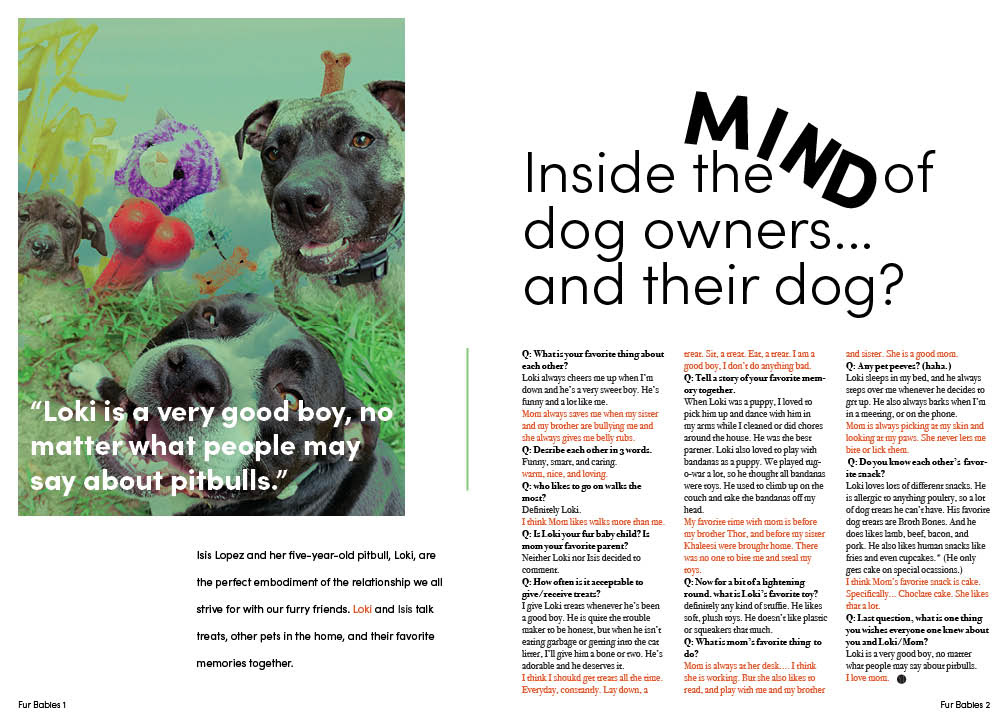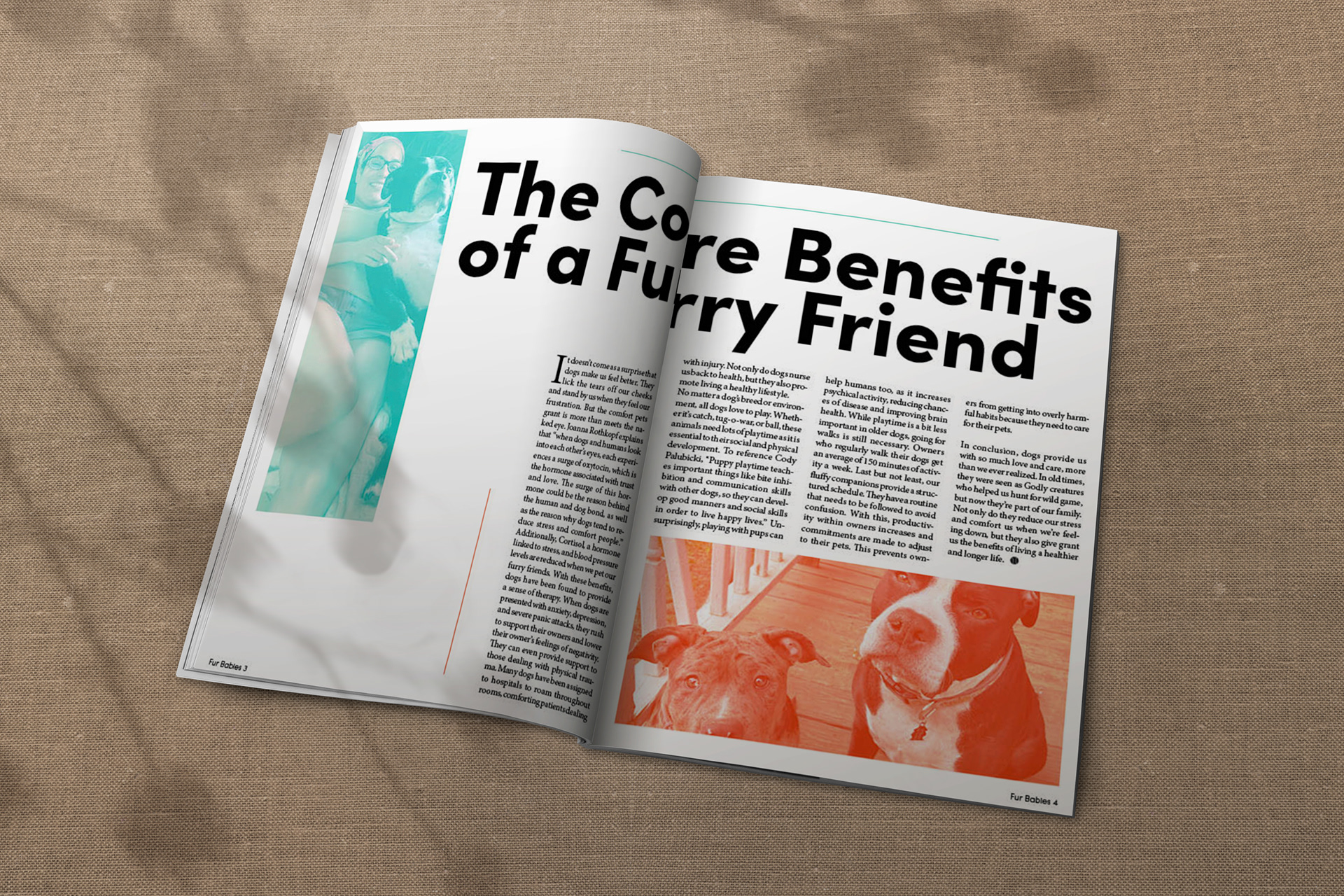 To effectively create a playful magazine, I used a bright color palette and bold headers to pull in the viewer and incentive them to read the articles. The focus Furbabies magazine is drastically different than most, as the dogs point of view is prioritized over owners and these so called, “dog experts.”