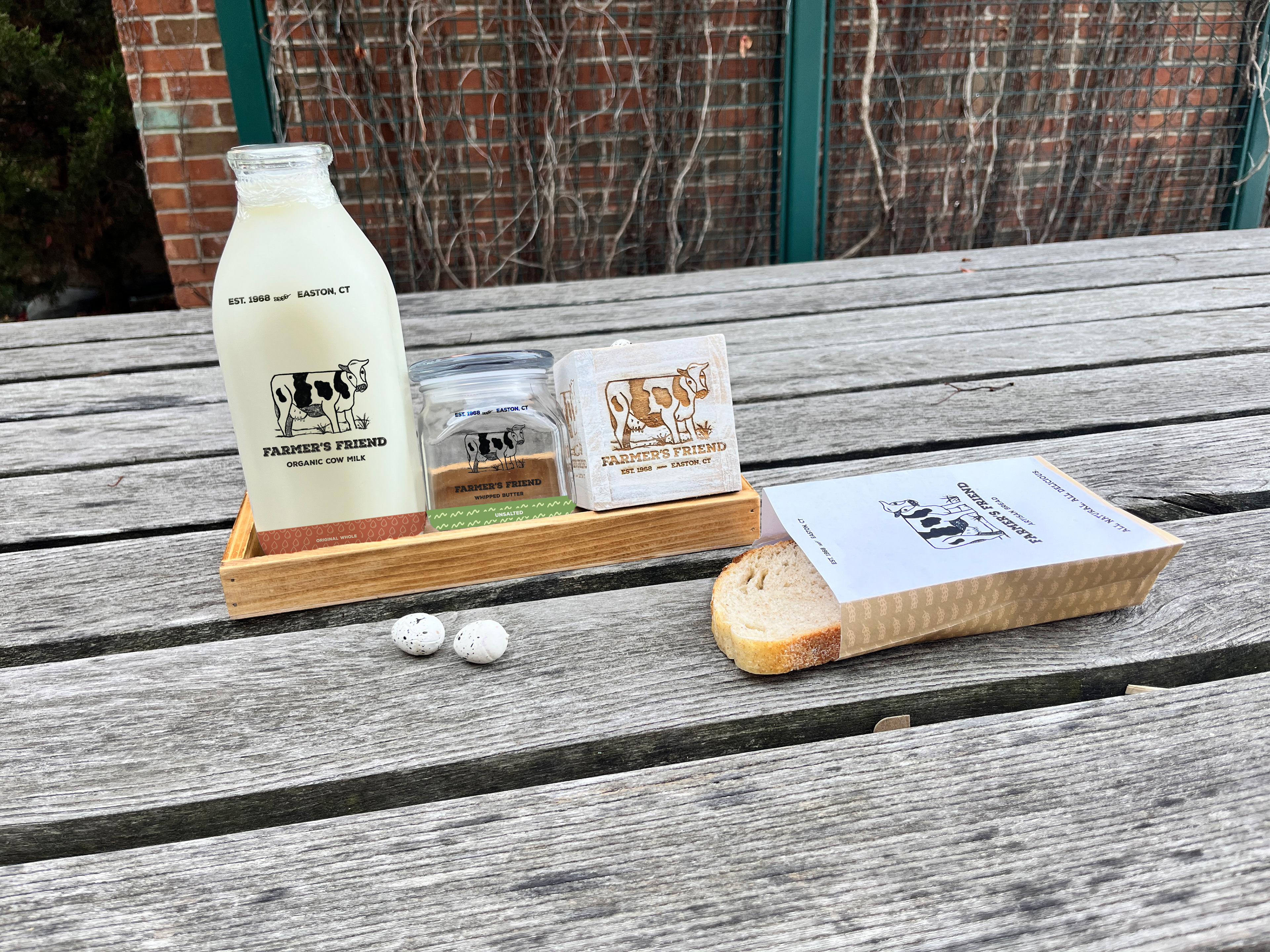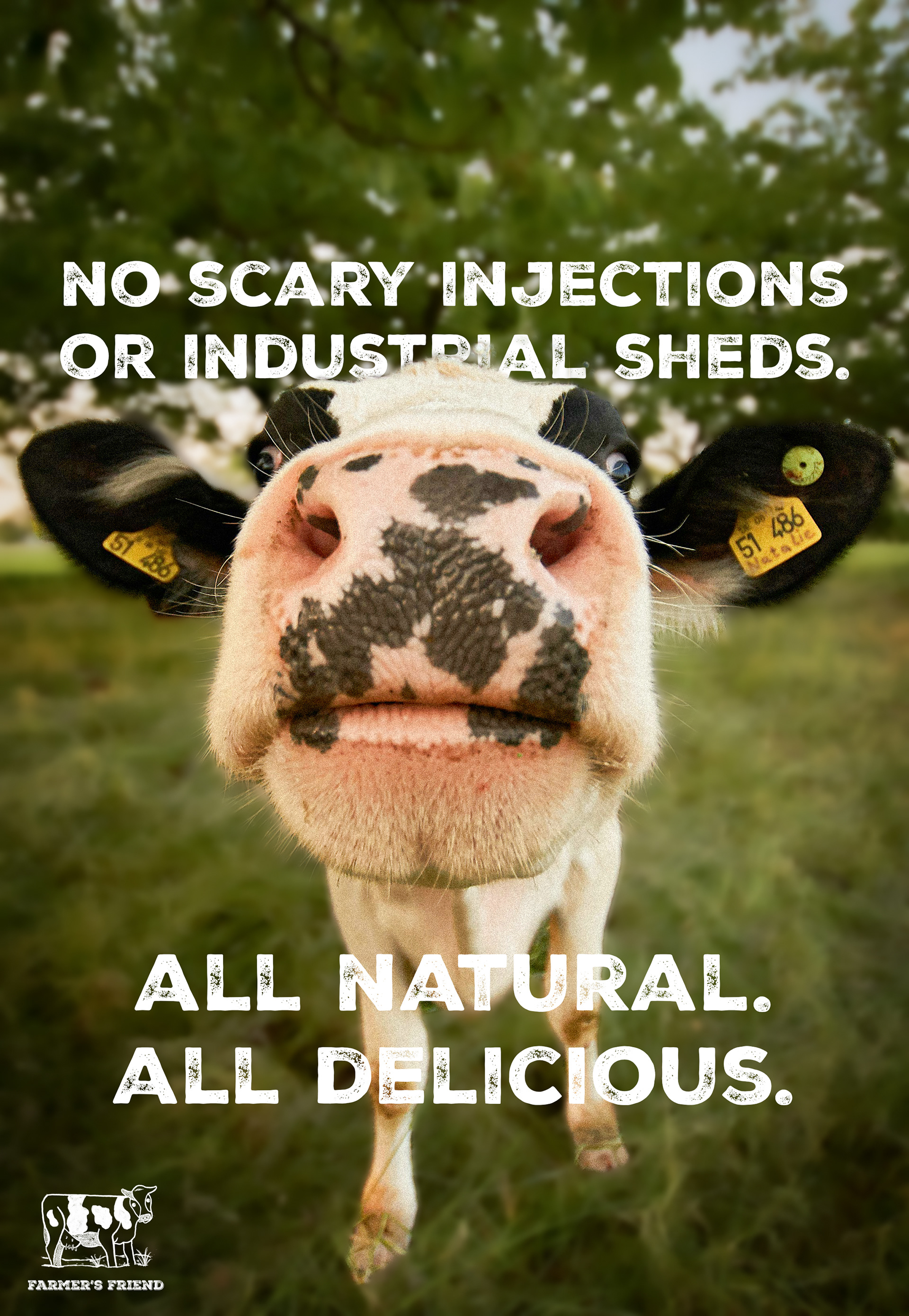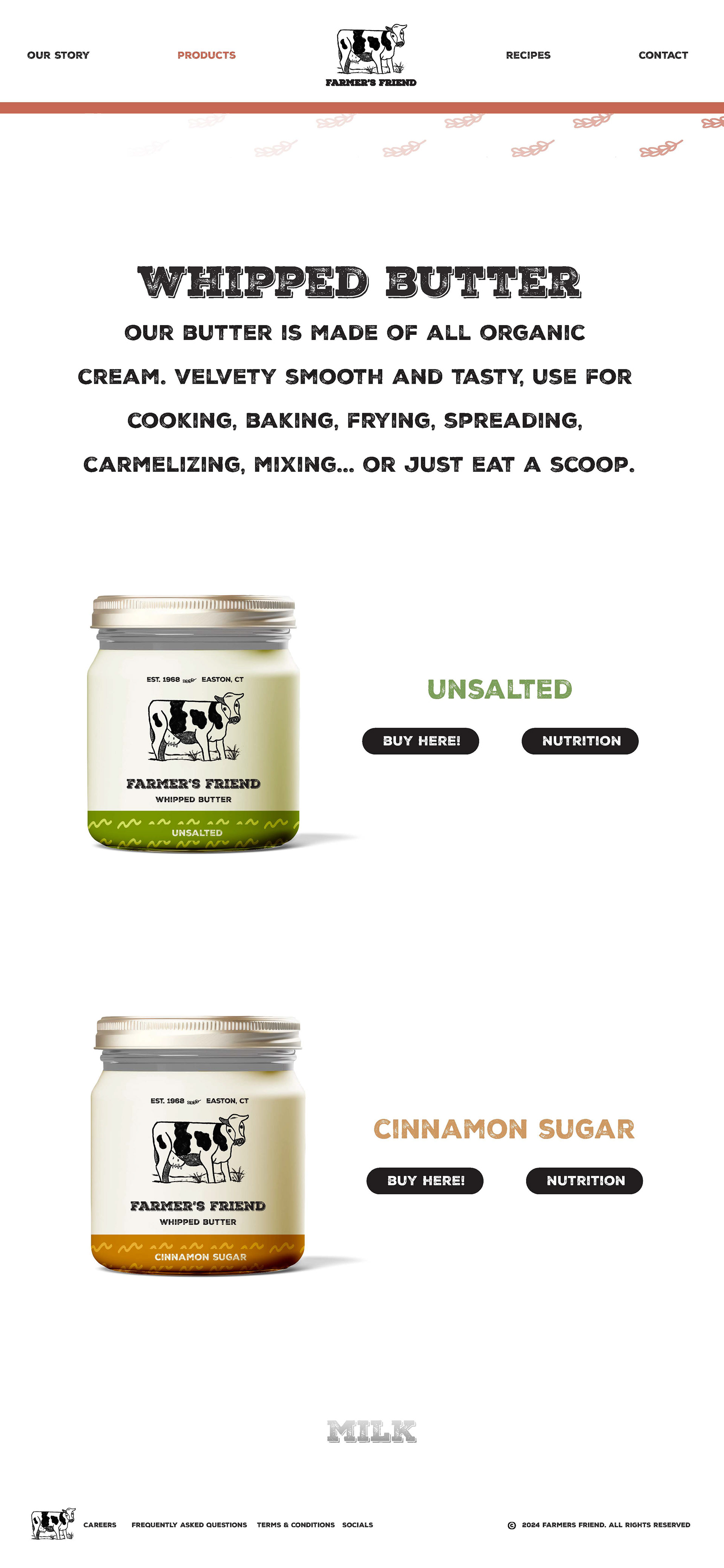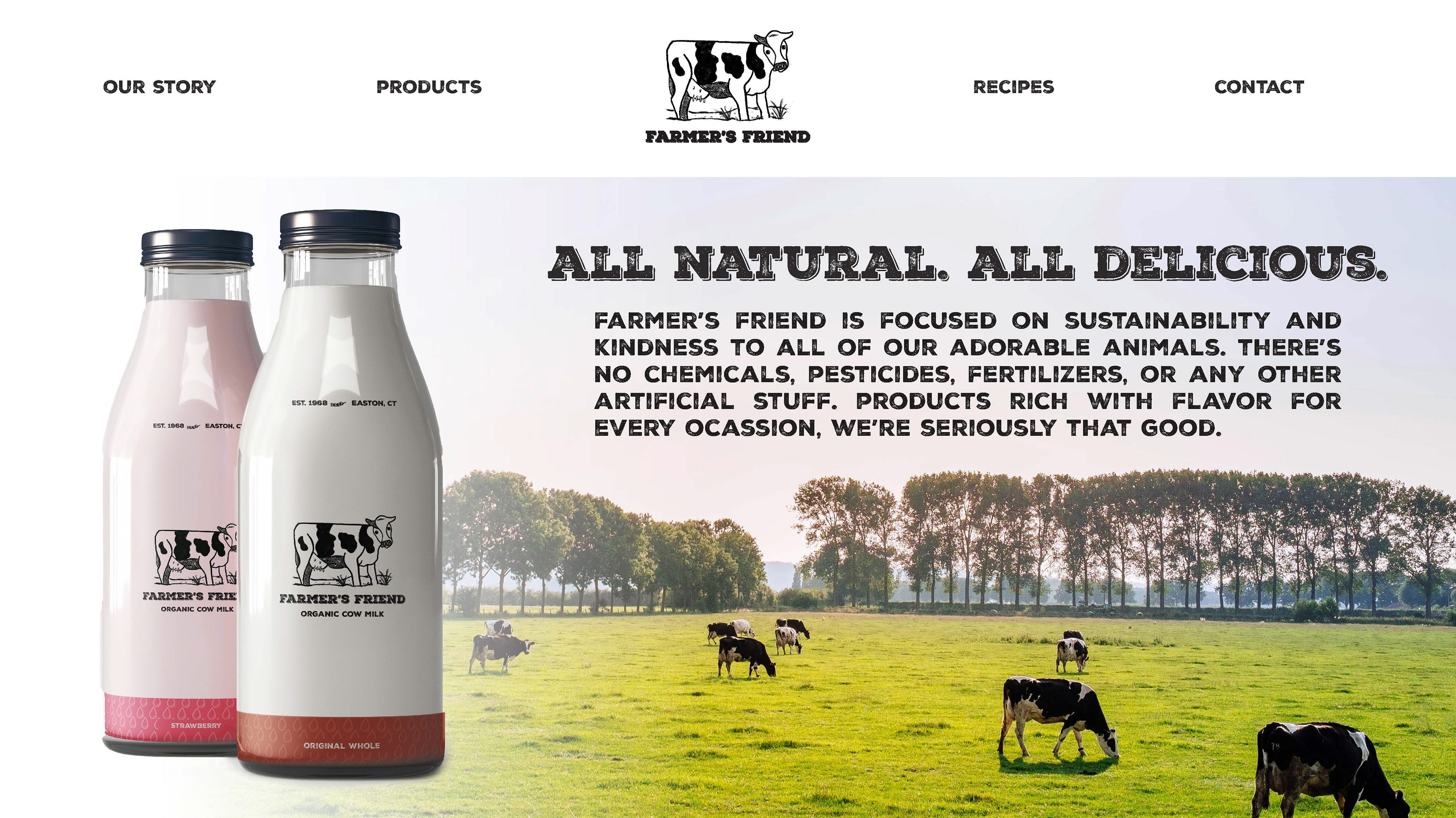 For my Farmer’s Friend product line, I showed the wide variety of products that can be made through treating animals on the land with love for the sacrifices they make. The a cow has soft grass beneath her feet to emphasize sustainable practices and implemented patterns and soft colors to evoke warmth within viewers. Rustic typography shows a sense of hard work and community that comes with traditional farming.